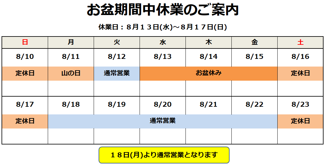 平素は格別のご愛顧を賜り、誠にありがとうございます。誠に勝手ながら、弊社では下記の期間、お盆休みとさせて頂きます。
