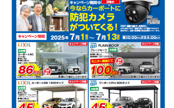 2025年6月27日おすすめ商品編集者01 防災・防犯対策キャンペーン『防災防犯対策・リフォーム キャンペーン』のご案内です!! キャンペーン期間:7/1(火)~7/13(日) 今回キャンペーン対象のカーポート設置をご契約頂いたお客様に限り 360°撮影可能な防犯カメラが付いてきます! & […]
