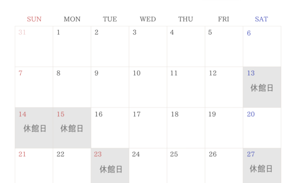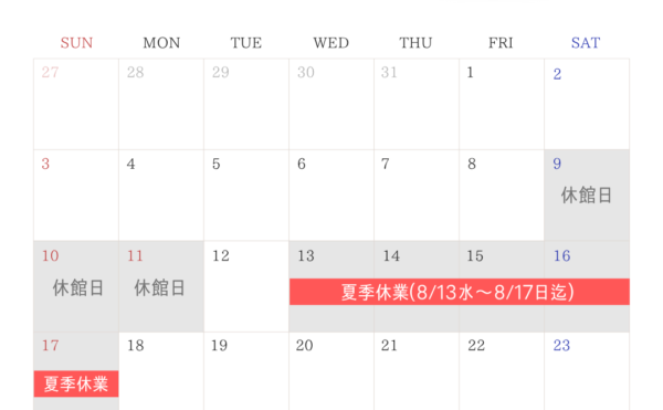 2025年7月28日お知らせ編集者01 8月匠館営業日のお知らせいつも匠館をご利用いただきありがとうございます。 8月匠館の開館日のご案内です。 ************************** 【営業時間】 平日 10:00~16:00 土日祝 10:00~16:00 *** […]
