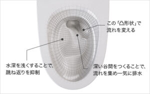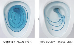 時間をかけて(約20秒)まんべんなく洗い、流れの方向を変えて一気に排水。スゴピカ素材(有機ガラス系)ならではの形状が生み出した、おそうじラクラク水流です。